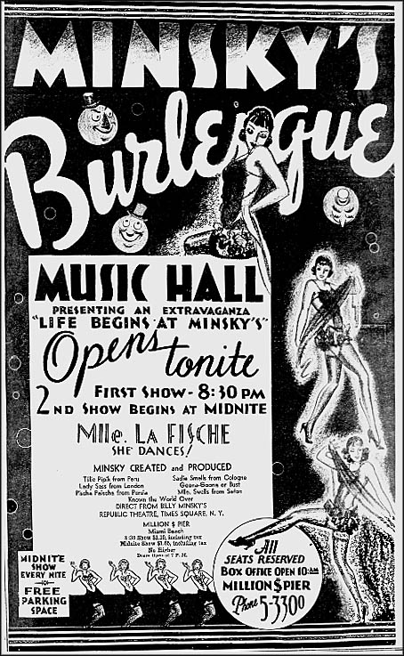 The pier, a concrete walkway flanked by a bandshell and dance pavilion jutting across the man-made beach where Ocean Drive and Biscayne Street come together, was built in the early 1920s by flamboyant casino owner and fight promoter George R.K. Carter. He put a two-story building on the pier's tip to house what became the city's most popular strip joint, Minsky's Burlesque, and he called it Carter's Million Dollar Pier.